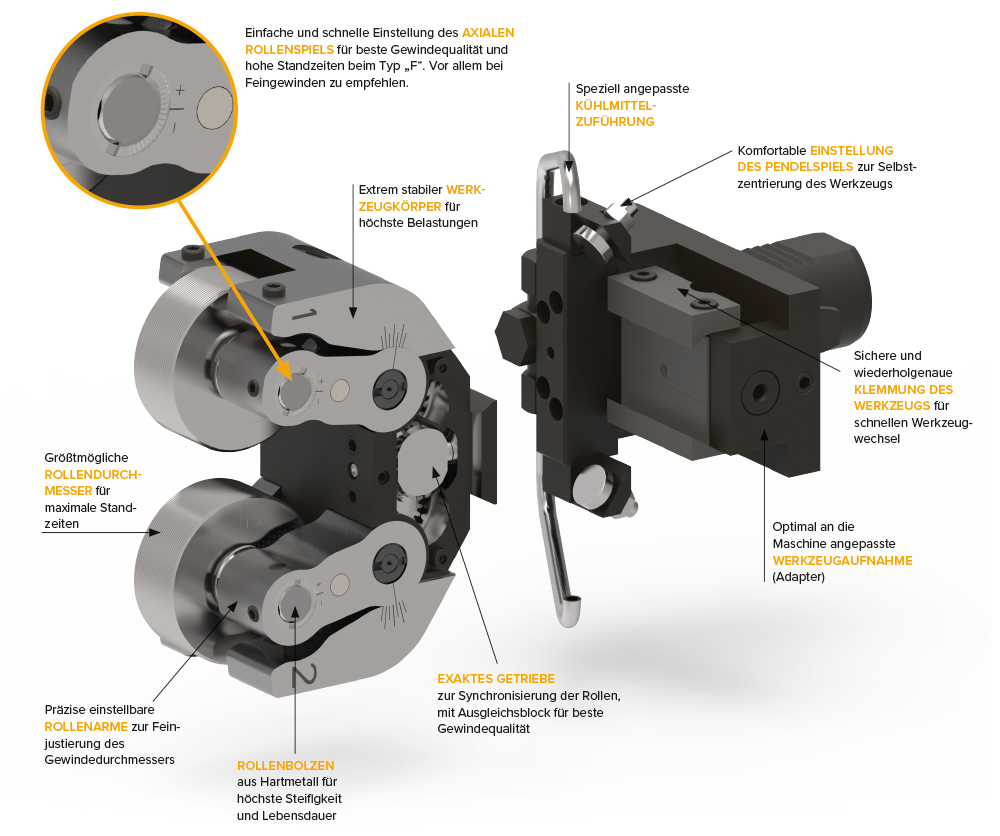 Einfache und schnelle Einstellung des AXIALEN ROLLENSPIELS für beste Gewindequalität und hohe Standzeiten beim „Typ F“. Vor allem bei Feingewinden zu empfehlen.
